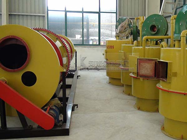 雞屎烘干機現(xiàn)場物料經(jīng)鏟車送到料倉再送到定量輸送的螺旋進料口進入烘干機內(nèi),烘干機筒體內(nèi)附有揚料板,中間有攪拌打散系統(tǒng),筒體轉(zhuǎn)速和攪拌軸的轉(zhuǎn)速均可快慢調(diào)節(jié),從而可使物料顆粒均勻,吸收充分熱量烘干速度快。烘干后的物料經(jīng)皮帶輸送機運至料場,燃燒部分由煤經(jīng)煤氣發(fā)生爐轉(zhuǎn)化成煤氣進行燃燒,進一步提高燃料利用率,減少了因煤直接燃燒生成大量硫化物、粉塵造成的污染,烘干過程中的煙氣經(jīng)旋風除塵器收塵進入水池吸收處理。